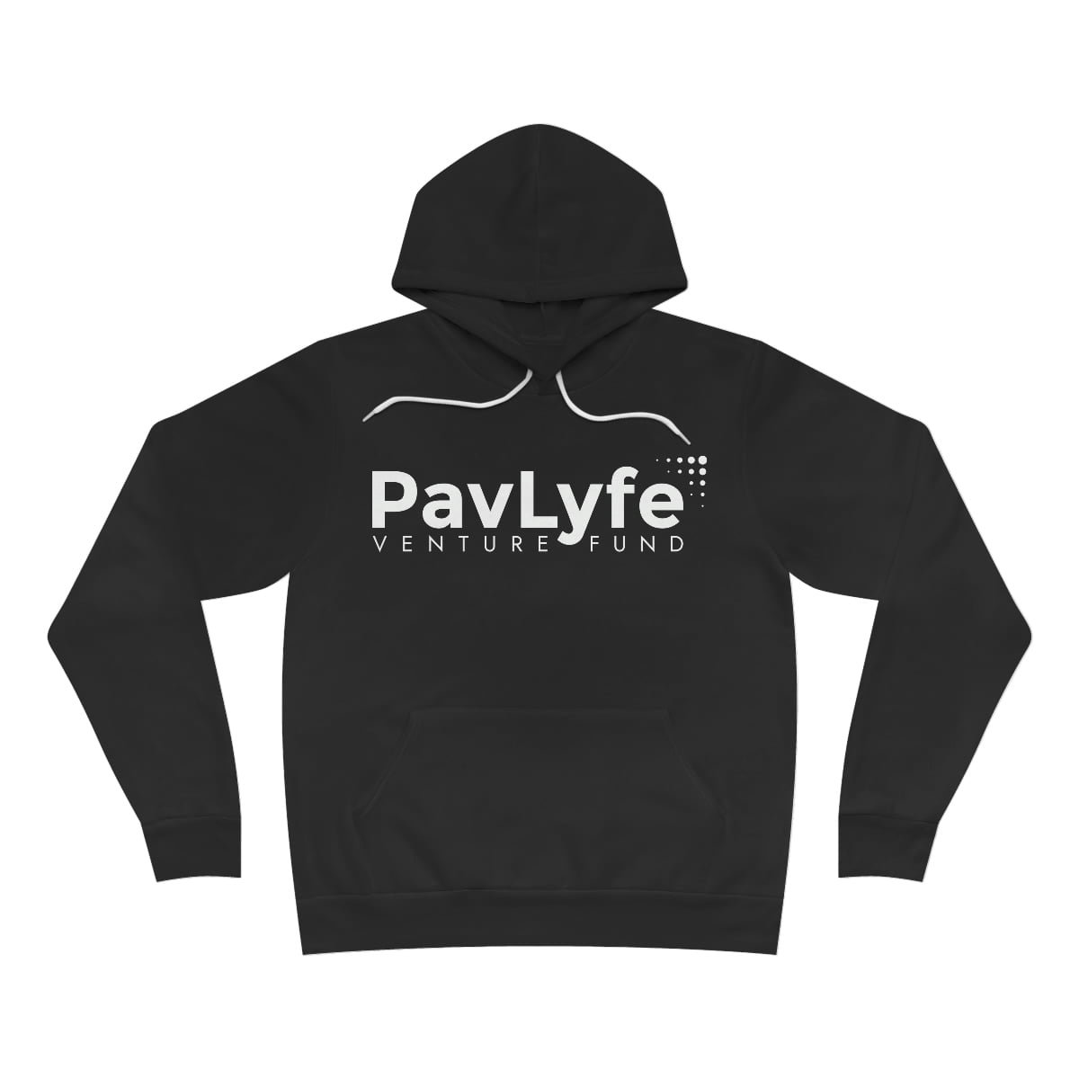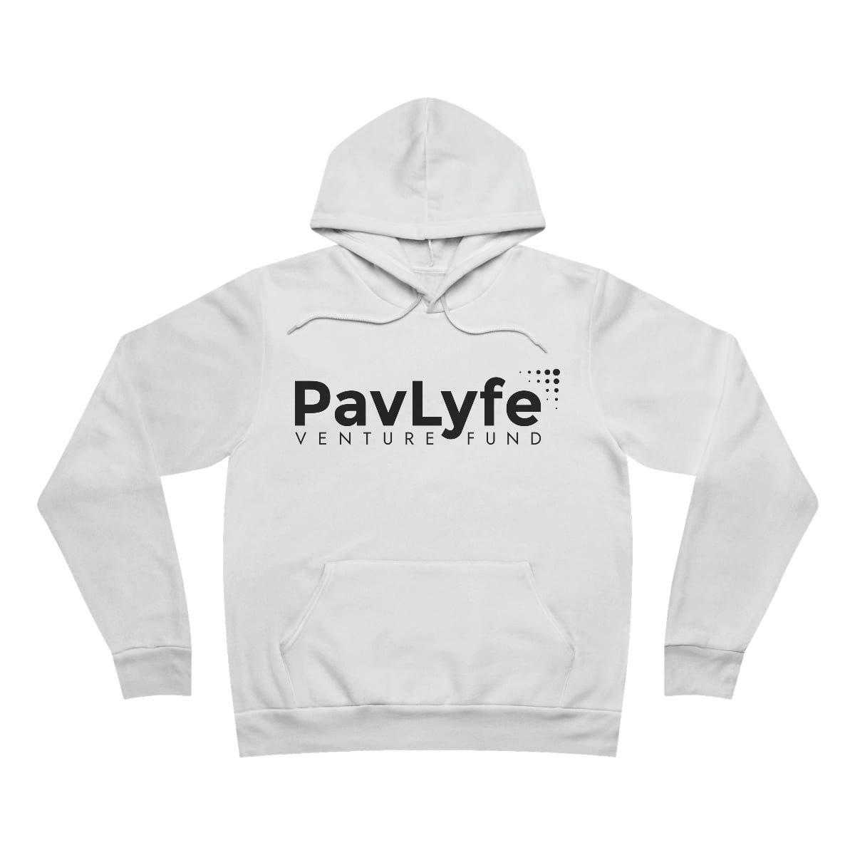 The PavLyfe Venture Fund unisex sponge fleece pullover hoodie is a blend of Airlume cotton and polyester. The percentages vary according to color. A pouch-style pocket spreads across the lower half of the garment’s front. The hood can be tightened with a white drawcord. Both cuffs and waistband have ribbing for extra grip.